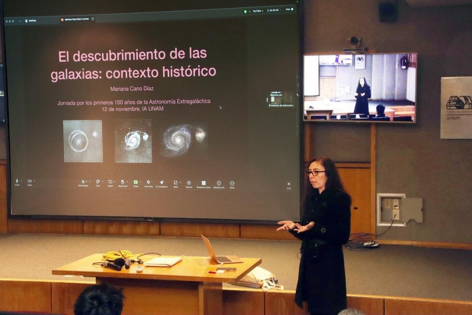 La “Jornada por los primeros 100 años de la astronomía extragaláctica” inició con la ponencia de la Dra. Mariana Cano Díaz sobre el contexto histórico del descubrimiento de las galaxias, en la que compartió un recuento de los descubrimientos astronómicos y diversas propuestas del s. XIX y principios del s. XX que derivaron en un evento llamado el Gran Debate celebrado en abril de 1920 entre los astrónomos Harlow Shapley y Heber Curtis. Shapley defendía que la Vía Láctea era el Universo entero, mientras Curtis sostenía que en el Universo había múltiples galaxias, islas del Universo. La controversia culminó en 1925, cuando Edwin Hubble publicó sus resultados y convenció a la comunidad que una de las nebulosas que se observaban, Andrómeda, estaba en realidad a una gran distancia, siendo así un sistema estelar como la Vía Láctea. Para medir la distancia a esta y a muchas otras nebulosas, Hubble usó una relación de la astrónoma Henrietta S. Leavitt para las estrellas variables Cefeidas, mismas que él logró resolver en estas nebulosas, demostrando así su naturaleza extragaláctica.