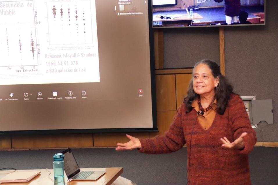 La Dra. Irene Cruz González, con la charla “La evolución de la astronomía extragaláctica en el IA-UNAM”, compartió algunas de las aportaciones más destacadas de los investigadores del Instituto hasta los años 90, y que fueron publicadas mayormente en el Boletín de los Observatorios de Tonantzintla y Tacubaya y en la Revista Mexicana de Astronomía y Astrofísica. Recordó trabajos observacionales de Guillermo Haro, Paris Pişmiş, Manuel Peimbert, Silvia Torres, Margarita Rosado, Alfonso Serrano, Elsa Recillas, Miriam Peña y trabajos teóricos de Arcadio Poveda y Claudio Firmani. Concluyó resaltando que la astronomía extragaláctica requiere el uso de telescopios ubicados en diversos lugares del mundo, además de los propios en México. En el IA UNAM se desarrolló también una importante escuela en el estudio de los núcleos activos galácticos, iniciada por la Dra. Deborah Dultzin, quien por motivos de fuerza mayor no pudo presentar la charla al respecto.