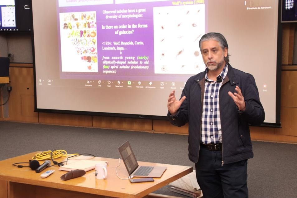 En su charla “Un siglo de avances en la astronomía extragaláctica”, el Dr. Vladimir Ávila Reese resumió los logros de esta disciplina, utilizando analogías con la biología. Al descubrir un nuevo tipo de objetos, en ciencia, lo primero que se hace es clasificarlos. Y así, el mismo Hubble hizo “taxonomía” galáctica para crear el sistema de clasificación morfológica vigente. También estudió el movimiento de las galaxias mostrando que todas se alejan unas de otras, con lo cual cosmólogos como Lemaître y Einstein concluyeron que el Universo se expande. En años posteriores, con observaciones multifrecuencia, se realizaron estudios “anatómicos” y “fisiológicos” de las galaxias, mostrando que son sistemas complejos compuestos no solo de estrellas, sino también de materia interestelar, núcleos activos galácticos y mucha materia oscura. A nivel “ecológico”, con la realización de grandes censos del cielo se entendió que las galaxias tejen una compleja estructura filamentaria siguiendo un patrón de acumulamiento jerárquico. A finales del siglo pasado y principios de este se consolidó el entendimiento “genético” de las galaxias como producto de la evolución gravitacional de perturbaciones de materia generadas en el Universo temprano. Y con poderosos telescopios espaciales, como el Hubble y el James Webb, se ha podido ver la evolución en acción y comparar con detalladas simulaciones numéricas de evolución de galaxias.